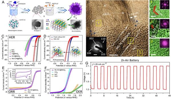 對此,我校木士春教授研究組通過Mo-N界面耦合作用,將MoS2納米片垂直封裝在由MOF(metal-organic framework)衍生的氮摻雜碳(N/C)材料中,制備出了一種先進(jìn)的多功能電催化劑(Mo-N/C@MoS2)。結(jié)合實驗和密度泛函理論(DFT)計算研究,這一催化劑表現(xiàn)出非常高的ORR、OER和析氫反應(yīng)(HER)催化活性及穩(wěn)定性。當(dāng)該催化劑作為可充鋅空電池的陰極電催化劑時,表現(xiàn)出了優(yōu)異的電輸出性能:最高能量密度高達(dá)196.4 mW cm–2,5mA cm-2電流密度下效率高達(dá)63%,25 mA cm-2電流密度下的循環(huán)穩(wěn)定性超過了48h。這些優(yōu)異的性能可歸功于其獨特的三相活性點(MoS2邊緣缺陷活性點、Mo-N界面耦合中心活心點和N-C活性點)和有利于擴散及傳質(zhì)的分級多孔結(jié)構(gòu)。該成果已發(fā)表在《先進(jìn)功能材料》(AdvancedFunctional Materials, 2017, 27, 1702300)期刊上。論文第一作者為來自非洲加納的博士研究生Ibrahim Saana Amiinu。論文發(fā)表后,受到了廣泛關(guān)注,單月下載量曾高居前6。