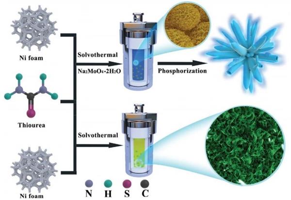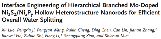 合理設計雙功能電催化劑是實現水電解的關鍵。近日,武漢理工大學木士春/李能團隊合作,提出了一種新的自上而下策略,通過局部磷化合成分層支化的鉬摻雜硫化物/磷化異質結構(Mo-Ni3S2/NixPy中空納米棒)。實驗和理論計算證明,空心棒狀異質結構具有優化的電子構型,化學吸附能以及豐富的異質界面和活性位點,能夠協同促進堿性條件下的雙功能HER/OER活性和穩定性。電流密度達50 mA cm-2時,過電位僅為238 mV。此外,當同時作為陰極和陽極組裝時,只需要1.46 V的超低電池電壓就可達10 mA cm-2的電流密度,耐久性超72 h。理論計算表明,摻雜的異質結構可以協同優化中間體的自由能,從而加速水電解的動力學。本項工作強調了金屬摻雜與界面工程合理結合對先進催化材料的重要性。