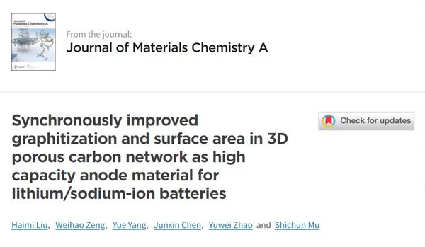 近日,武漢理工大學木士春研究團隊在Journal of Materials Chemistry A(影響因子:11.301)上發表題為“Synchronously improved graphitization and surface area in 3D porous carbon network as high capacity anode material for lithium/sodium-ion batteries”的研究工作。