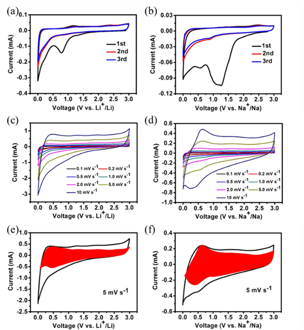 圖4 (a): 鋰離子電池在0.1 mV s-1掃速下的CV 曲線。(b): 鈉離子電池在0.1 mV s-1掃速下的CV 曲線。(c): 鋰離子電池在不同掃速下的CV曲線。(d): 鈉離子電池在不同掃速下的CV曲線。(e): 鋰離子電池在5 mV s-1掃速下的伏安響應曲線。(f): 鈉離子電池在5 mV s-1掃速下的伏安響應曲線。