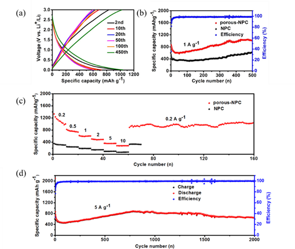 電化學測試結果表明,porous-NPC用作鋰離子電池負極材料時,在1 A g-1的電流密度下,在循環450圈后,可逆容量能從第50圈時的574 mAh g-1增加到1038 mAh g-1,庫倫效率達到99%以上。Porous-NPC具有優異的倍率性能,當電流密度回到0.2 A g-1時,可逆容量高達973 mAh g-1。在5 A g-1的電流密度下也表現出優異的長循環性能。