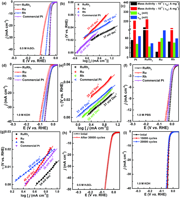 3)設(shè)計(jì)和構(gòu)建的RuRh2雙金屬烯納米催化劑具有超低起始電位、高催化活性和在全pH范圍內(nèi)的良好穩(wěn)定性。而且,即使在酸性介質(zhì)中進(jìn)行30000次循環(huán)后,仍能保持穩(wěn)定的析氫,優(yōu)于Pt催化劑和其他已報(bào)道的HER催化劑。合金效應(yīng),由RuRh2引起的應(yīng)變效應(yīng)以及由于薄片的厚度而引起的量子尺寸效應(yīng)可以調(diào)整體系的電子結(jié)構(gòu),從而優(yōu)化氫的吸附/解吸行為。