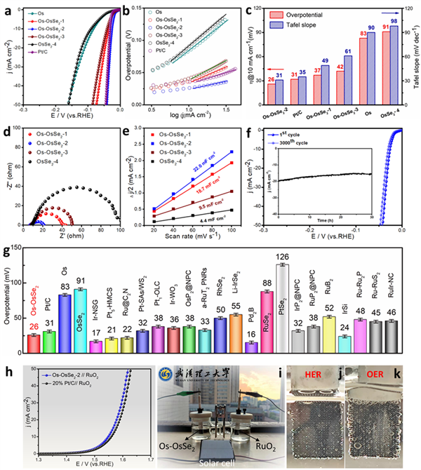 最后,為確定構(gòu)效關(guān)系,在酸性介質(zhì)中進(jìn)行了一系列電化學(xué)性能測(cè)試。測(cè)試結(jié)果表明,所有相比例的Os-OsSe2的過(guò)電位(?)和Tafel斜率相對(duì)于純Os和OsSe2都大大降低。這表明Os-OsSe2異質(zhì)結(jié)構(gòu)形成后HER的動(dòng)力學(xué)得到了顯著加速。此外,Os和OsSe2具有最佳相比例平衡點(diǎn),共同提供最活躍的HER位點(diǎn)。當(dāng)Os和OsSe2的相豐度約為45%和55%時(shí),Os-OsSe2的HER活性達(dá)到最高。此時(shí),在0.5 M H2SO4中的析氫過(guò)電位僅為26 mV,Tafel斜率為31 mV dec-1。該HER活性超過(guò)了大多數(shù)文獻(xiàn)報(bào)道的貴金屬基電催化劑活性。接下來(lái),結(jié)合電化學(xué)阻抗譜(EIS)、電化學(xué)活性表面積(ECSA)等進(jìn)一步探討了Os-OsSe2性能提高的內(nèi)在因素。此外,測(cè)試前后電化學(xué)性能的比較以及測(cè)試后XRD、XPS、STEM、ICP等表征表明,Os-OsSe2在連續(xù)HER過(guò)程中具有良好的穩(wěn)定性。將Os-OsSe2作為水電解制氫裝置的陰極材料,取代商業(yè)Pt/C催化劑,與商業(yè)RuO2共同驅(qū)動(dòng)酸性全水解反應(yīng),展現(xiàn)了良好的效果。此外,本文進(jìn)一步演示了太陽(yáng)能制氫系統(tǒng),可以觀察到H2和O2在陰極和陽(yáng)極的快速析出,表明Os-OsSe2具有重要的潛在應(yīng)用價(jià)值。同樣,我們進(jìn)一步探究了催化劑在1 M KOH中的HER性能,Os-OsSe2在堿性環(huán)境中也表現(xiàn)出非常優(yōu)異的HER活性和穩(wěn)定性。