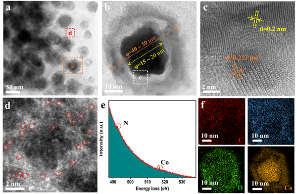 Fig. 2. Morphology and structure of EA-MOF-Co. (a) and (b) TEM images, (c) HRTEM image, (d) aberration-corrected HAADF-STEM image, (e) monodisperse Co atoms structure analyzed by EELS, (f) HAADF-STEM EDS mapping. Copyright 2022, Elsevier Inc.