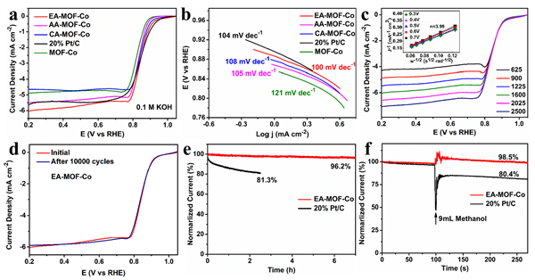 Fig. 3. ORR performance in alkaline electrolytes. (a) LSV curves, (b) Tafel plots, (c) LSV curves of EA-MOF-Co at different rotation rates (inset: corresponding Koutecky-Levich plots), (d) LSV curves of EA-MOF-Co before and after 10,000 CV cycles, (e) i-t curves and (f) methanol resistance test. Copyright 2022, Elsevier Inc.
