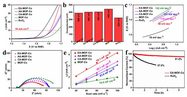Fig. 4. OER performance evaluation. (a) LSV curves, (b) overpotentials summary at 10 mA cm-2, (c) Tafel plots, (d) Nyquist plots for MOF-Co, CA-MOF-Co, AA-MOF-Co and EA-MOF-Co obtained at 1.65 V, (e) the current density variation at 0.15 V versus Hg/HgO plotted against with the scan rates, (f) i-t curves of EA-MOF-Co and RuO2. Copyright 2022, Elsevier Inc.