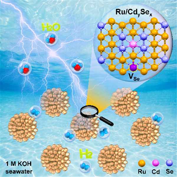 針對上述問題,南京曉莊學(xué)院劉蘇莉教授與武漢理工大學(xué)木士春教授合作設(shè)計和構(gòu)建了一系列具有對稱破缺中心的Ru/CdySex高效析氫催化材料。其中,Cd或Se以原子態(tài)分散在Ru團(tuán)簇中,從而在原子水平上打破了Ru團(tuán)簇的對稱結(jié)構(gòu)。在堿性和堿性海水溶液中,Ru/Cd0.02Se4催化劑的析氫反應(yīng)(HER)過電位在10 mA cm-2電流密度下均低至7 mV以下,并且亦具有非常好的穩(wěn)定性。相關(guān)研究成果發(fā)表于國際能源領(lǐng)域頂級期刊Nano Energy上。