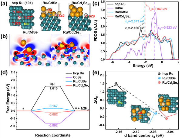 Figure 1. (a) Ru?H bond lengths of Ru, CdSe, Ru/CdSe, and Ru/CdySex models. (b) Differential charge density diagram of Ru/CdSe and Ru/CdySex. he red and blue areas represent accumulation and depltion of electron density, respectively. (c) d band center positions of Ru, CdSe, Ru/CdSe, and Ru/CdySex models. (d) H* Gibbs free energy (ΔGH*) for Ru, CdSe, Ru/CdSe, and Ru/CdySex models. (e) Linear relationship between ΔGH* and d band centers on Ru, Ru/CdSe, and Ru/CdySex models.
