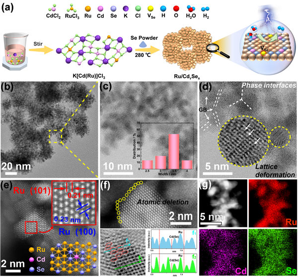 基于此,武漢理工大學(xué)木士春和南京曉莊學(xué)院劉蘇莉等首先通過密度泛函理論(DFT)計算,證明Ru簇中的Cd和Se單原子位摻雜(Ru/CdySex)可以通過在對稱破壞界面的Ru-Se-Cd配體有效地破壞Ru對稱結(jié)構(gòu)。通過用原子分散的非化學(xué)計量CdySex取代部分Ru原子,驅(qū)動原位產(chǎn)生亞穩(wěn)態(tài)對稱破壞結(jié)構(gòu)和更多原子空位,并調(diào)節(jié)Ru原子的配位環(huán)境,從而優(yōu)化Ru-H鍵和更多通道用于H遷移。