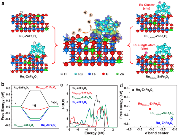 理論計(jì)算結(jié)果表明,Ru團(tuán)簇與單原子競爭性配位成功調(diào)控了ZnFe2O4催化性能,不僅加快了水分子吸附和活化的反應(yīng)步驟,還優(yōu)化Ru位點(diǎn)對氫中間體的吸附-解吸能壘,使其具有非常接近Pt催化劑的氫吸附/脫附吉布斯自由能。這為探索Ru團(tuán)簇和單原子相互作用對HER電化學(xué)性能的影響提供了新的路徑。