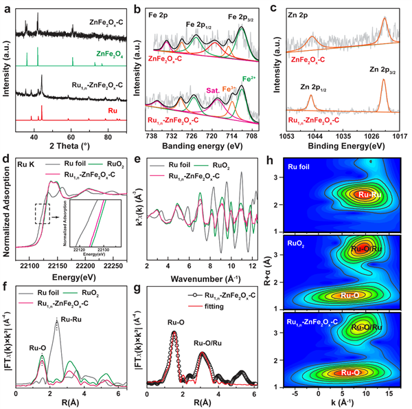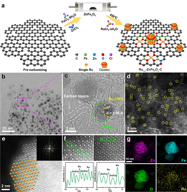 圖2. Ru1,n-ZnFe2Ox-C催化劑形成示意圖及其形貌和結(jié)構(gòu)表征