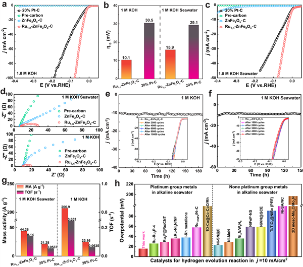 實(shí)驗(yàn)結(jié)果表明,在堿性純水和堿性海水中電解制氫,Ru1,n-ZnFe2Ox-C催化劑相對于Pt催化劑具有更加優(yōu)異的析氫活性和穩(wěn)定性:當(dāng)?shù)竭_(dá)10mA ? cm-2析氫電流密度時,其過電位分別僅為10.1和15.9 mV,Tafel則分別低至22 和33 mV?dec-1。此外,該催化劑能穩(wěn)定運(yùn)行150小時以上,表現(xiàn)出很高的電化學(xué)穩(wěn)定性。