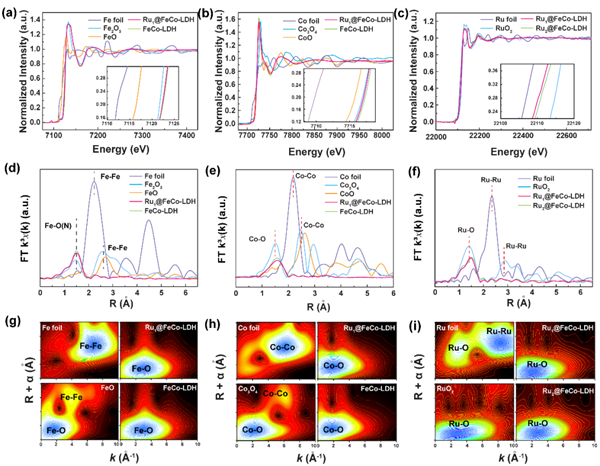 圖2 (a)分別以Co箔和標準CoO或Co3O4粉末為參考,得到的Ru SACs@FeCo-LDH的(a)Fe K邊、(b)Co K邊和(c)Ru K邊XANES譜。(d)在Fe箔、三氧化二鐵、氧化亞鐵、Ru1 SACs@FeCo-LDH和FeCo-LDH的R空間上的傅里葉變換(FT)。(e)Co箔、Co3O4、CoO、Ru1 SACs@FeCo-LDH和FeCo-LDH的R空間上的FT。(f)Ru箔、RuO2和Rux SACs@FeCo-LDH的R空間上的FT。(g-i)分別為(b)Co K邊、Fe K邊和Ru K邊的EXAFS光譜的FT k3加權函數。@ The Authors