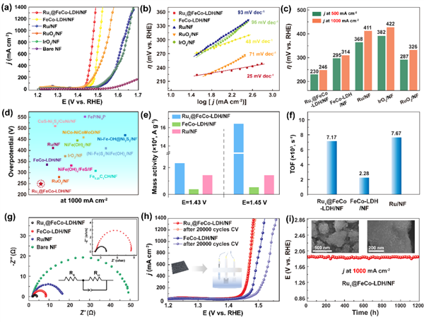 此外,對于Ru1 SACs@FeCo-LDH,其在η=200 mV下的質量活性(MA)比FeCo-LDH高大約6倍,比Ru催化劑高大約2倍(圖3(e)),證實了由于Ru的引入,活性位點的增加。即使在更大的過電位下,它的MA達到了一個令人驚訝的值,遠遠超過了對比催化劑。此外,在η=200 mV處,周轉頻率(TOF) 計算結果為7.17X103 s-1,假設Co是Ru1 SACs@FeCo-LDH中的活性原子(圖3(f)),與報道的催化劑相比是最高的。