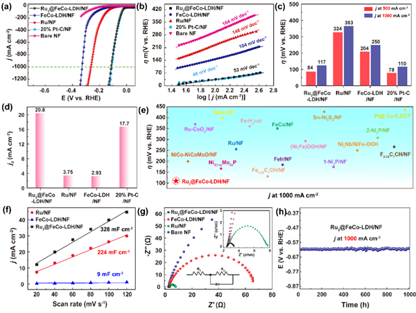 圖4 1M氫氧化鉀中的(a)極化曲線;(b)對應的Tafel圖;HER電催化在500 mA cm2和1 A cm2處的過電位的(c)比較;(d)交換電流密度的比較(j0);(e)在1.0 M氫氧化鉀溶液中,與最近報道的HER催化劑在1 A cm2的過電位相比;(f)計算的Cdl;(g)Nyquist圖;(h)Ru2 SACs@FeCo-LDH在維持1000 h所需電位的時間演化下的時間-電位曲線。@ The Authors