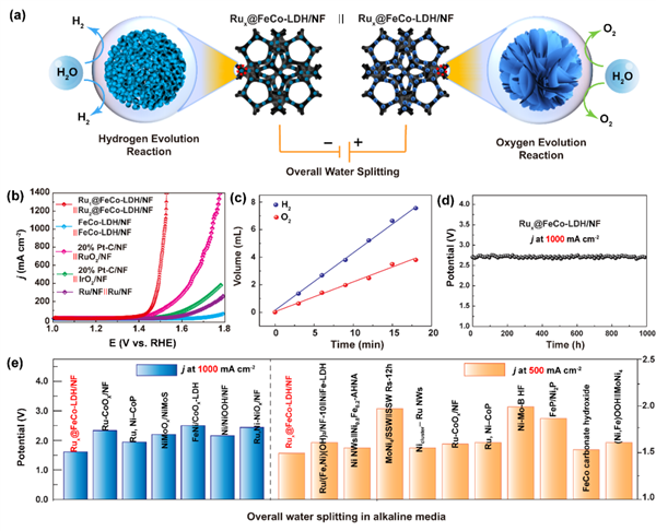 考慮到Ru1 SACs@FeCo-LDH和Ru2 SACs@FeCo-LDH催化劑具有優異的OER和HER性能,作者分別組裝了一個以兩種催化劑為陽極和陰極的堿性電解槽(圖5(a))。令人印象深刻的是,在1.0 M KOH溶液中,這種電解槽在所有樣品中表現出最好的整體水分解活性(圖5(b))。此外,從圖5(c)可知,H2和O2的收集量約為2:1,法拉第效率接近100%,表明Rux SACs@FeCo-LDH對水分解具有較高的催化選擇性。更重要的是,在1 A cm2處連續測試超過1000小時,Rux SACs@FeCo-LDH的應用電位衰減可以忽略不計的,這表明其具有良好的耐久性(圖5(d))。所制備的Rux SACs@FeCo-LDH是一種很有前途的工業規模的整體水分解催化劑(圖5(e))。