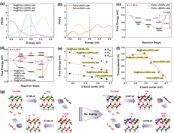 圖6 (a)和(b)計算了Ru SACs@FeCo-LDH和FeCo-LDH上的Fe、Co和Ru活性位點的部分態密度。(c)在FeCo-LDH上,和在 (d) Rux SACs@FeCo-LDH的OER過程的能量分布。(e)ΔGOOH*、ΔGOH*、ΔGO*與d帶中心之間的關系。(f)過電位作為d帶中心的函數的火山圖。(g)FeCo-LDH和Ru SACs@FeCo-LDH的Co活性位點上代表性OER機制。@The Authors