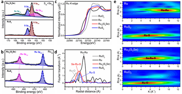 樣品制備方面,作者通過熔融鹽法,來實現(xiàn)純相RuS2晶體(只有一種Ru位點)中,部分S位點被Se原子取代,進(jìn)而形成了具有非等價Ru位點Ru2(S3Se)樣品。如圖1所示,XRD中(200)晶面的低角度偏移是由于Se和S原子直徑不同所導(dǎo)致的,也層面證明了Se原子的替位。TEM圖片表明Ru2(S3Se)樣品顆粒尺寸主要集中在50 nm左右。球差電鏡和元素分析也進(jìn)一步說明了Ru2(S3Se)樣品具有很高的結(jié)晶度,同時Ru,S和Se元素相對均勻分布,其原子位置也與理論模型能夠匹配。