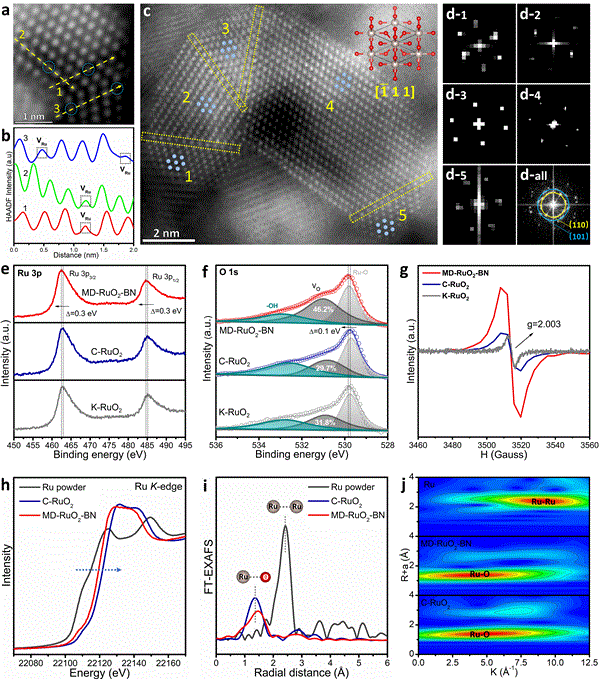 總之,該研究將具有大量Ru/O空位和粒內/粒間邊界的RuO2納米單體組裝到雙連續納米反應器中,實現了RuO2電子結構和微觀結構的同步優化。Ru氧化態的降低和Ru-O鍵的延長削弱了Ru-O的相互作用,抑制了晶格氧的氧化和高價Ru的溶解,從而提高了RuO2的耐久性。同時,豐富的反應區域和高效的低配位活性原子共同提高了催化活性。因此,定制的MD-RuO2-BN在三電極電池裝置和質子交換膜水電解槽(PEMWEs)中表現出優異的析氧反應(OER)活性和穩定性。此外,氫水一體化循環供電系統的示范為Ru基材料的應用提供了更多的機會。該研究顯示了改善無ir基OER催化劑催化性能的見解,并將推動PEMWEs的發展,從而實現大規模綠色氫氣發電。