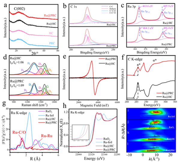 為了進一步明確PRC和Ru@PRC的結構和缺陷信息,課題組進行了一系列的光譜表征。如圖3a所示,經過熱處理后的PRC和Ru@PRC催化劑顯示出典型的缺陷碳特征,表明發生了C60鍵的斷裂和重組。C 1s光譜和拉曼光譜中更高的缺陷峰比例表明,富含五元環拓撲缺陷的碳材料比同樣經過堿刻蝕的常規碳六元環材(HC)具有更高的缺陷度。拓撲缺陷的不飽和配位碳原子產生的不配對電子導致共軛C=C鍵的減弱。經XAFS分析表明,具有豐富拓撲缺陷的富勒烯衍生的Ru@PRC具有比Ru@HC低得多的π*共振強度。電子順磁共振測試(EPR)進一步證實了這一推論。對于完美的石墨碳,由于π*軌道的離域,不存在不成對電子,而碳基體的拓撲缺陷將會導致大量不成對電子的存在。如圖3e所示,Ru@PRC呈現出明顯的對稱峰,進一步說明Ru@PRC中存在豐富的拓撲缺陷。此外,由于Ru原子和C原子之間的p-d軌道雜化效應,電子由Ru團簇向PRC轉移,Ru 3p光譜中Ru的峰位發生了明顯負移。XAFS分析結果確認了Ru@PRC中存在Ru-Ru配位(配位數約為2.2),再次證明Ru以納米團簇存在。