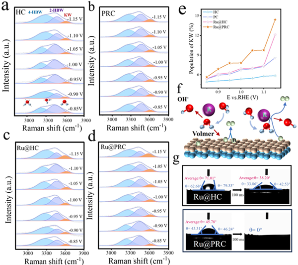 Figure 5. In situ Raman spectra of interfacial water on (a)HC, (b) PRC, (c) Ru@HC and (d) Ru@PRC in 1M KOH solutions (E versus RHE). (e) The population of KW from in situ Raman spectra. (f) Schematic showing interfacial water dissociation on Ru@PRC. (g) Contact angles of Ru@HC and Ru@PRC using the KOH electrolyte.