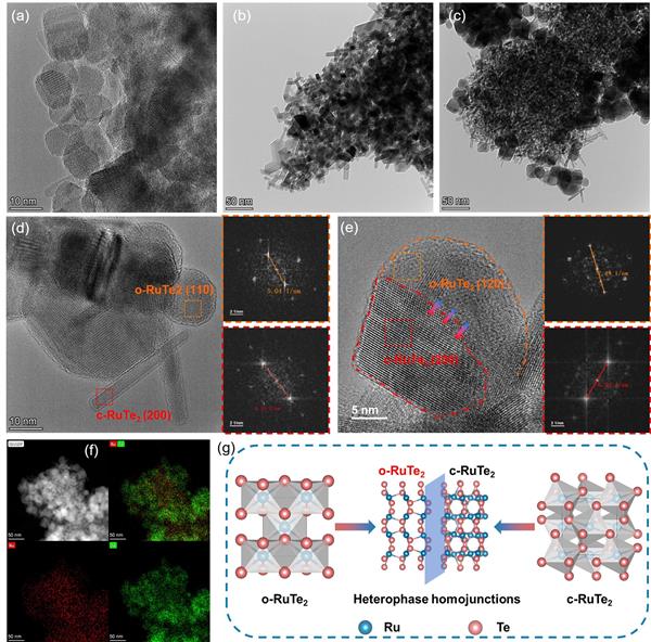 圖3. (a)o-RuTe2、(b) c-RuTe2和(c) m-RuTe2的TEM圖像,(d-e) m-RuTe2的HRTEM圖像及相應(yīng)區(qū)域的FFT圖像:橙色:o-RuTe2,紅色:c-RuTe2,(f) m-RuTe2的能譜分布圖。(g) 異相同質(zhì)結(jié)結(jié)構(gòu)形成的示意圖。