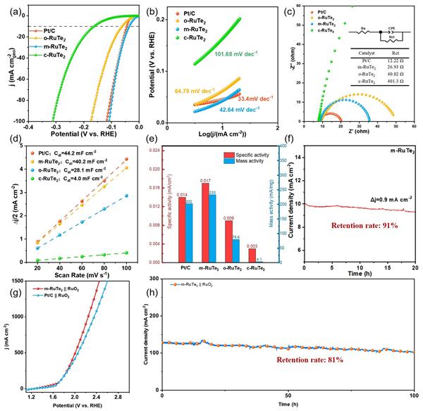 圖4. (a) 各類RuTe2樣品的LSV曲線(掃描速率:10 mV s-1),以Pt/C作為參照。(b) 不同催化劑的Tafel斜率和(c) 奈奎斯特圖。(d) 不同催化劑的雙電層電容。(e) 不同催化劑在50 mV過電位下的質(zhì)量活度與比活度。(f) m-RuTe2的恒電壓穩(wěn)定性測試。(g) m-RuTe2//RuO2與Pt/C//RuO2的全水解性能對比。(h) m-RuTe2//RuO2體系的恒電壓穩(wěn)定性測試。
