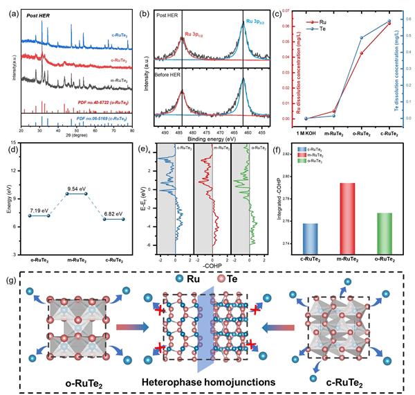 圖5. (a) 合成催化劑在HER后的XRD圖譜。(b) m-RuTe2在HER測試前后的Ru 3p的XPS光譜的變化。(c) 不同RuTe2催化劑電催化后電解質(zhì)中溶解的Ru和Te濃度。(d) 不同RuTe2催化劑中Ru的計算去金屬化能。(e) -COHP在不同RuTe2催化劑中的Ru-Te帶。(f) 不同RuTe2催化劑中Ru-Te帶至費米能級的積分-COHP比較。(g) 兩相形成異質(zhì)同質(zhì)結(jié)結(jié)構(gòu)的示意圖,該結(jié)構(gòu)抑制了活性金屬的溶解。