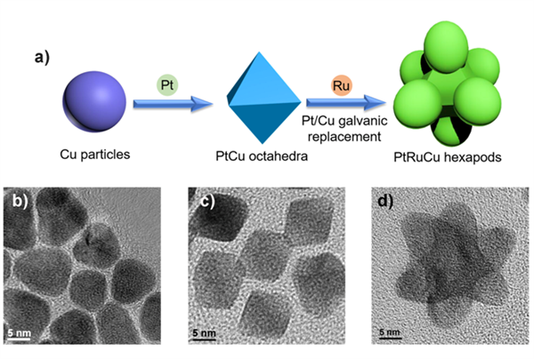 通過控制反應(yīng)時(shí)間,得到了不同形貌的PtRuCu納米顆粒:首先,醋酸銅被還原為銅顆粒;之后,先和容易被還原的Pt形成PtCu八面體,再和Ru共同生長成PtRuCu六足狀納米顆粒。