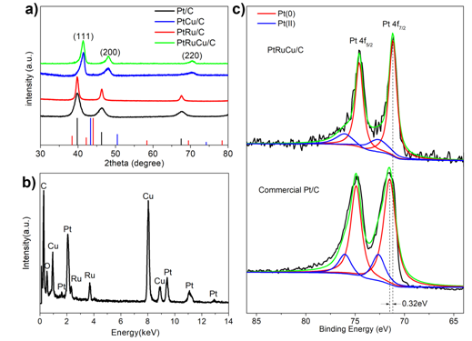 圖3. (a)Pt/C, PtCu/C, PtRu/C 和PtRuCu/C的XRD圖; (b)PtRuCu的EDS圖;(c)PtRuCu/C和Pt/C 的X射線光電子能譜(XPS)圖。