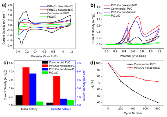 圖4. 樹突狀PtRuCu/C、六足狀PtRuCu /C、PtCu/C 和Pt/C的(a)CV圖,(b)甲醇氧化反應(yīng)(MOR)曲線,(c) 質(zhì)量活性和比活性比較圖,以及(d)Pt/C 和六足狀PtRuCu/C的穩(wěn)定性對(duì)比圖。