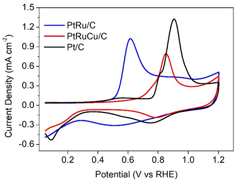 圖5. PtRuCu/C、商業(yè)PtRu/C和商業(yè)Pt/C的CO 剝離伏安曲線。