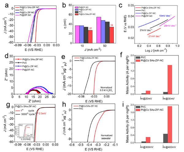 電化學測試表明,Pt@Co SAs-ZIF-NC在酸性條件下表現(xiàn)出優(yōu)異的析氫活性和穩(wěn)定性,達到10 mA cm-2的電流密度僅需27 mV的過電勢,由于Pt/C和其它對比樣,且在海水中測試也顯示出優(yōu)于Pt/C的質量活性,顯示了在海水電解水制氫方面的潛在應用價值。
