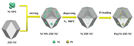 首先分別合成出Ni納米顆粒和ZIF-8,ZIF-8經(jīng)高溫退火獲得ZIF-NC,而后在室溫下使Ni納米顆粒吸附在ZIF-NC表面,經(jīng)過二次高溫退火后得到Ni摻雜的氮碳前驅(qū)體Ni ZIF-NC,將Ni ZIF-NC與H2PtCl6溶液在70 oC下混合攪拌,經(jīng)過250 oC的低溫還原得到最終Ni位點分離的Pt基催化劑。