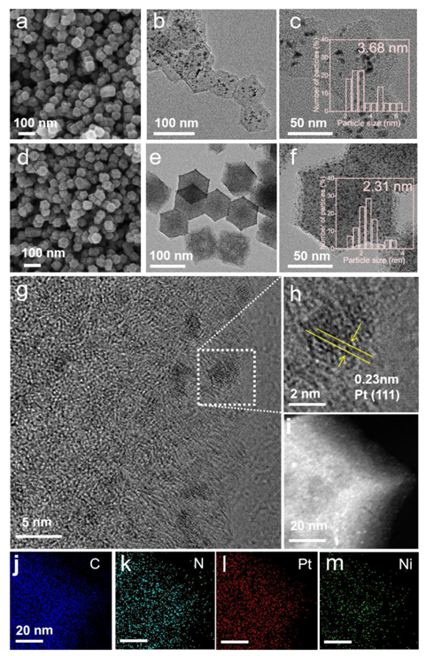 圖2 Pt@ZIF-NC的形貌表征:(a)SEM,(b)TEM和(c)放大TEM及Pt粒徑統(tǒng)計圖;Pt@Ni ZIF-NC的形貌表征:(d)SEM,(e)TEM,(f)放大TEM及Pt粒徑統(tǒng)計圖,(g)HRTEM,(h)放大HRTEM和(i-m)EDX元素公布圖