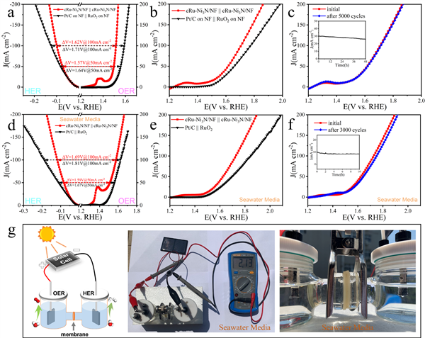 圖4. cRu-Ni3N異質結構在(a-c)傳統電解水、(d-f)海水電解及(g)光伏-產氫系統中的應用展示。