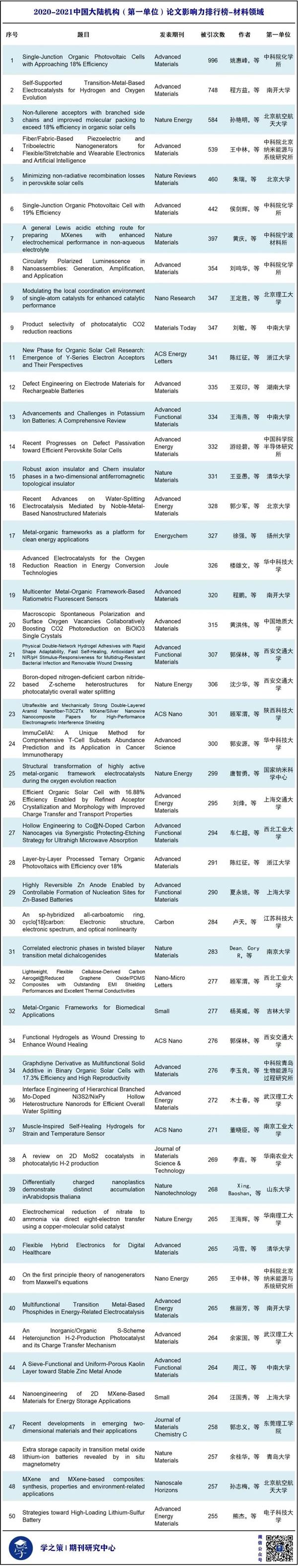 為了反映我國各領域科學家最具影響力的研究成果,本期我們整理了2020-2021年度,中國(大陸)科學家在材料領域的論文影響力排行榜。