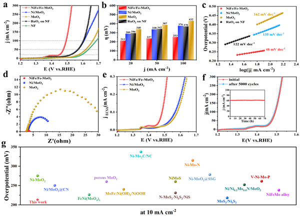 圖3. NiFe/Fe-MoO2催化劑在1 M KOH中析氧反應(OER)性能