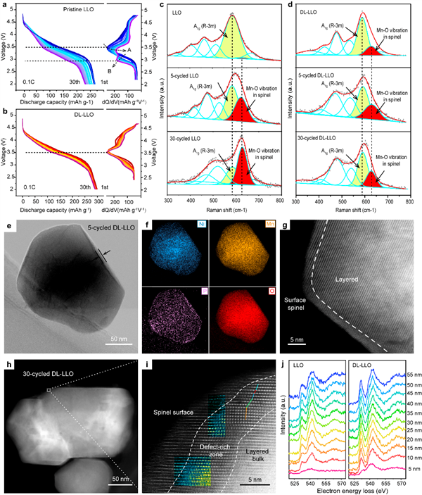 圖4. DL-LLO的電化學(xué)結(jié)構(gòu)穩(wěn)定性表征,a,b)LLO和DL-LLO30圈的dQ/dV曲線變化,c,d)Raman光譜,e,f,g)5圈循環(huán)后DL-LLO的TEM圖像,EDS mappings和HAADF TEM圖像,h,i)30圈循環(huán)后DL-LLO的HAADF STEM圖像,j)30圈循環(huán)后LLO和DL-LLO的O K-edge EELS譜。