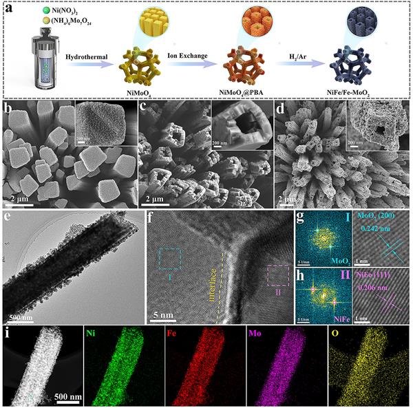 要點一:獨特的NiFe/Fe-MoO2空心異質納米棒結構使用鉬酸鎳納米棒作為模板,浸泡于鐵氰化鉀溶液。由于Kirkendall效應,鎳離子與鐵氰根離子配位的同時伴隨著鉬酸根離子的浸出,通過控制反應時間可以合成獨特的NiFe/Fe-MoO2空心納米棒結構催化劑。