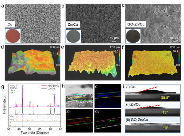 圖2. (a-c) GO-Zn/Cu、Zn/Cu、GO/Cu和純Cu基底的SEM和數字圖像(插圖),以及(d-f) Cu、Zn/Cu和GO-Zn/Cu的3D超景深圖。(g) GO-Zn/Cu和Zn/Cu電極的XRD譜圖。(h) GO-Zn/Cu電極的元素分析。(i)電解液與Cu、Zn/Cu和GO-Zn/Cu電極的接觸角大小。