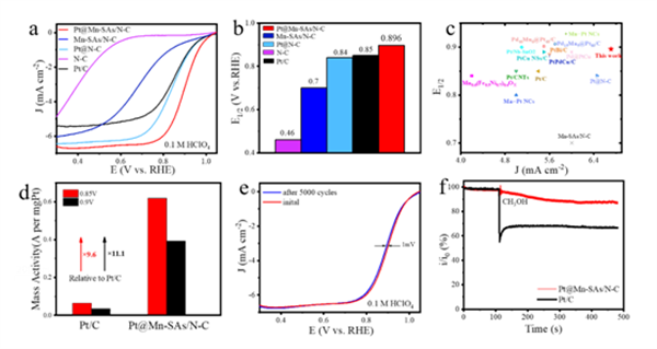 Figure 3. (a)ORR performance in acidic media. a) LSV curves and b) half-wave potentials of Pt@Mn-SAs/N-C, Mn-SAs/N-C, Pt@N-C, N-C and commercial Pt/C catalysts in 0.1 M HClO4 solution. c) Acidic ORR performance comparison of Pt@Mn-SAs/N-C with other reported catalysts, d) Mass activities of Pt@Mn-SAs/N-C and Pt/C catalysts at 0.85 V and 0.9 V. e) Acidic LSV curves of Pt@Mn-SAs/N-C before and after 5000 cycles, and inserted chronoamperometry test of Pt@Mn-SAs/N-C and Pt/C catalysts. f) Methanol tolerance tests of Pt@Mn-SAs/N-C and Pt/C catalysts in acidic media.(圖片來(lái)源:ACS Catalysis)
