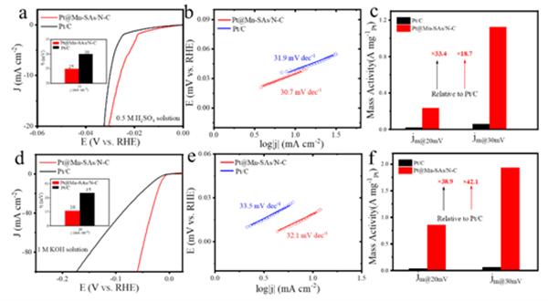 Figure 4. (a) LSV curves and b) corresponding Tafel slopes of Pt@Mn-SAs/N-C and Pt/C catalysts in acidic media. c) Mass activity of Pt@Mn-SAs/N-C and Pt/C at 20 and 30 mV in 0.5 M H2SO4 solution. d) LSV curves and e) corresponding Tafel slopes of Pt@Mn-SAs/N-C and Pt/C catalysts in alkaline media. f) Mass activity of Pt@Mn-SAs/N-C and Pt/C at 20 and 30 mV in 1 M KOH solution(圖片來(lái)源:ACS Catalysis)