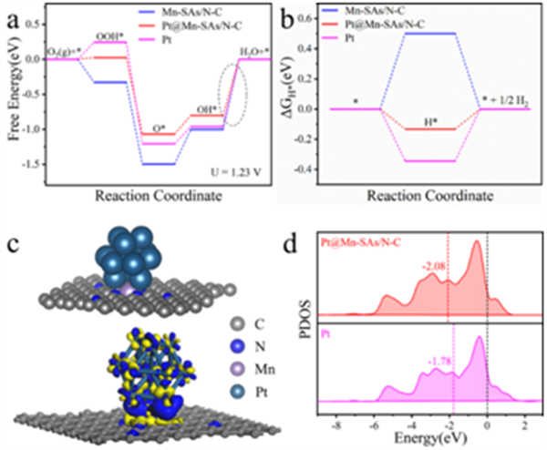 Figure 5. (a) ORR free energy diagram of Mn-SAs/N-C, Pt@Mn-SAs/N-C and Pt models. b) HER Gibbs free energy diagrams of these theoretical models. c) As-constructed model and differential charge density of Pt@Mn-SAs/N-C. d) PDOS of the d orbital of Pt atoms in Pt@Mn-SAs/N-C and Pt models.(圖片來(lái)源:ACS Catalysis)