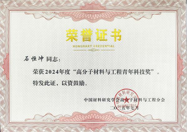 2025年7月6日在廈門召開的中國材料研究學會年度大會上,中國科學院長春應用化學研究所石恒沖研究員獲得 “2024年度高分子材料與工程青年科技獎”。