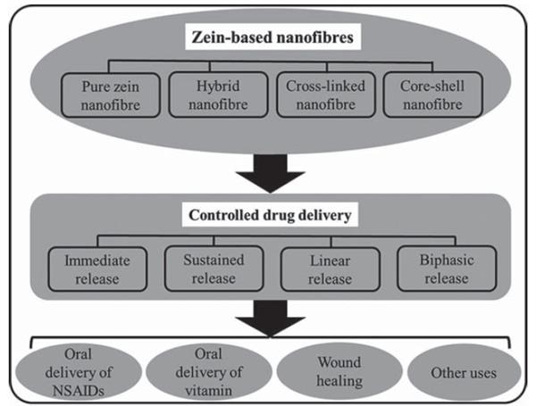 Plant proteins have been drawing increasing attention owing to their safety, abundance and relatively low cost in comparison with animal proteins. The development of plant protein-based delivery vehicles may lead to the provision of novel pharmaceutical products to patients. Zein is a class of alcohol-soluble prolamine proteins present in maize endosperm that was approved as a generally recognised as safe excipient in 1985 by the US FDA for use in pharmaceutical film coatings. Over the past few decades, numerous studies have been carried out to illustrate zein’s potential for novel applications in the biomedical field. This paper reviews the present status of zein-based nanofibres, with emphasis on their fabrication and biomedical applications, particularly for drug delivery. Their benefits and limitations are also discussed to provide further insight into zein’s potential as a promising biomaterial.