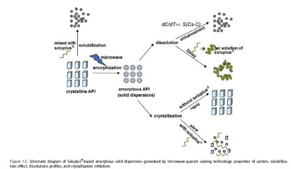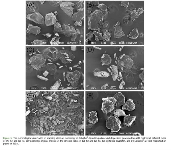 microscopy (SEM), differential scanning calorimetry (DSC), powder X-ray diffraction (PXRD), Raman spectroscopy (RS), and Fourier transform infrared spectroscopy (FT-IR) were adopted to analyze amorphous properties and molecular interactions in ibuprofen/Soluplus® amorphous solid dispersions generated by MQC. Dissolution, dissolution extension, phase solubility, equilibrium solubility, and supersaturated crystallization inhibiting experiments were performed to elucidate the effects of Soluplus® on ibuprofen in solid dispersions. This research provides valuable information on the inherent properties of Soluplus® and presents a basic understanding of Soluplus® as a carrier of amorphous solid dispersions.