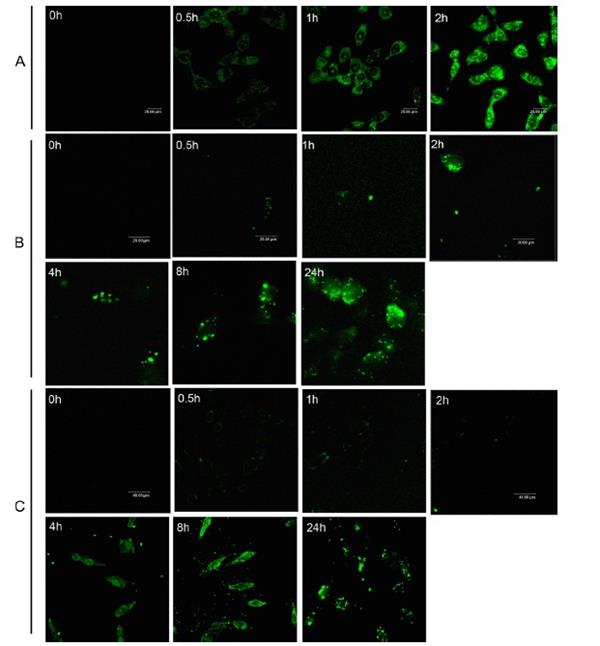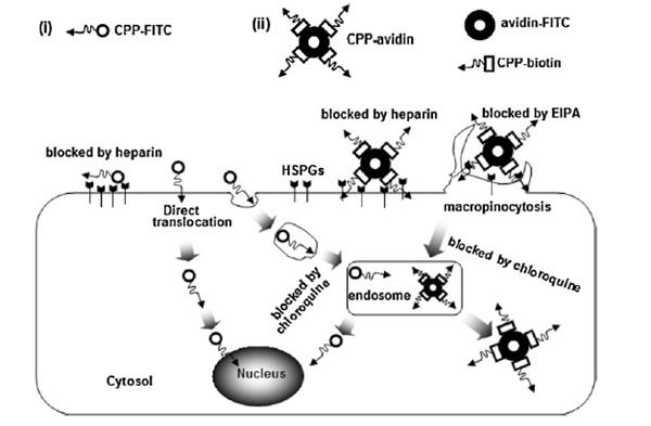 The application of cell-penetrating peptides (CPPs) for delivering various cargo molecules with biological functions into cells has gained much attention in recent years. However, the internalization mechanisms and delivery properties of CPP–cargo remains controversial. In this study, low- and highmolecular-weight cargoes attached to arginine-rich CPPs were employed: the former was the fluorescein isothiocyanate-labeled nona-arginine (CPP–FITC), and the latter was the fluorescently labeled nonaarginine–avidin complex (CPP–avidin). We measured the intracellular trafficking of CPP–FITC and CPP–avidin in four cancer cell lines in a series of microenvironments altered by the presence or absence of serum, different temperatures and different incubation times. The results revealed that CPP–cargo delivery exhibited no specificity toward any cell line, but the levels were found to be related to cell