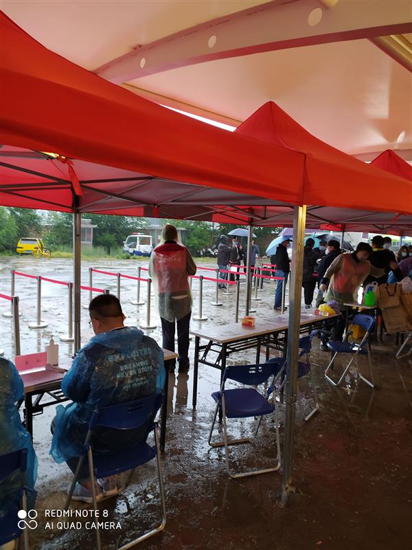接站區是火車站旁的貨場,臨時搭了簡易棚,此時天空下起了雨,氣溫特別低,后悔沒穿羽絨服,到了接站區已是瑟瑟發抖。好在給了一次性防護雨衣,穿上之后立刻暖活了不少,但雨越下越大還,很快,接站區沒有一塊干燥的地面了。而學生的車,左等右等也沒有來到,于是和一位資產處的、學生處的和學工辦的老師在那里聊著天。