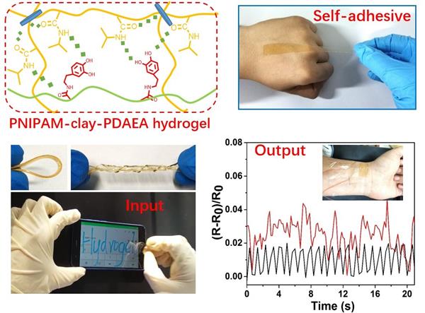 1.受到海洋生物貽貝的啟發,通過多巴胺修飾的多肽(PDAEA)與溫敏性聚N-異丙基丙烯酰胺(PNIPAM)結合,成功設計制備了一種具有可控粘附性和應變響應性的導電水凝膠。該材料具有良好的彈性、抗拉伸性和自修復性能。(Materials Chemistry Frontiers, 2020, 4,189-196.)